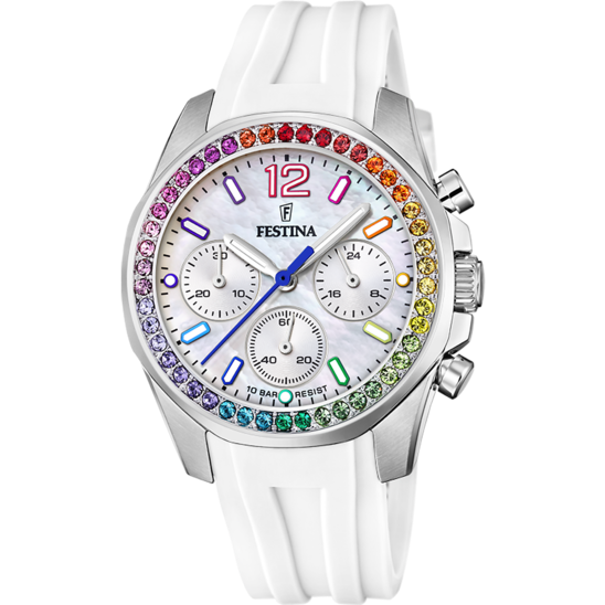 Orologio da donna con movimento al quarzo e funzioni di cronografo. Cassa in acciaio inox dal diametro di 38 mm e spessore di 11,3 mm. Lunetta impreziosita da cristalli multicolore. Quadrante bianco con indici a bastoni e numero arabo a ore 12. Cinturino in silicone bianco largo 19 mm. Resistente all'acqua fino a 100 metri di profondità.