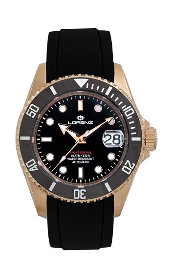 Orologio da uomo solo tempo, cassa rotonda in acciaio 316L placcata oro rosa, diametro 42 mm., lunetta in ceramica chocolate, vetro zaffiro con lente, fondo a vite con logo della tartaruga. Cinturino in resina doppia iniezione, movimento automatico Seiko NH35, resistente all'acqua fino a 10 atmosfere.