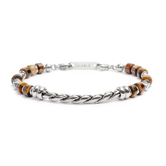 Bracciale in acciaio con rondelle in occhio di tigre alternate ad elementi in ematite ed acciaio. Al centro un elemento rigido con catena twisted serpentine. Lunghezza totale 21,5 cm, regolabile da 21,5 a 19,7 cm tramite logo tag Marlù in acciaio removibile. Materiali: acciaio, ematite, occhio di tigre