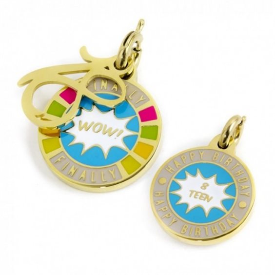 Charm doppio dedicato al 18esimo compleanno in acciaio con PVD oro. Il charm è composto da una piastrina superiore sagomata con il numero 18 e da una medaglietta di diametro 17 mm, sul fronte al centro è riportata la parola "WOW"