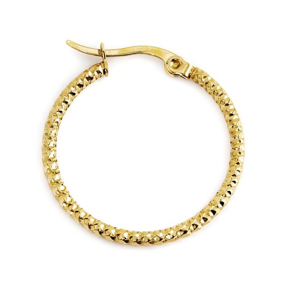 Orecchino mono cerchio in acciaio con pvd oro martellato con diametro 2,6 cm e spessore 0,19 cm.